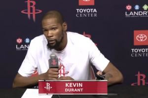 赛后,杜兰特参加新闻发布会,接受了记者的采访。