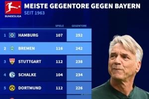 体育资讯9月26日讯 本周五晚拜仁即将在主场迎战不莱梅,德国转会市场网统计了德甲成立以来面对拜仁丢球数最多的10支球队,其中汉堡排名第一,不莱梅就位居第二。