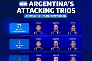 德转列阿根廷近5届世界杯三叉戟:
