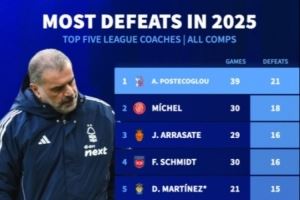 2025年五大联赛主教练输球场次排行:澳波21场居首,阿莫林15场